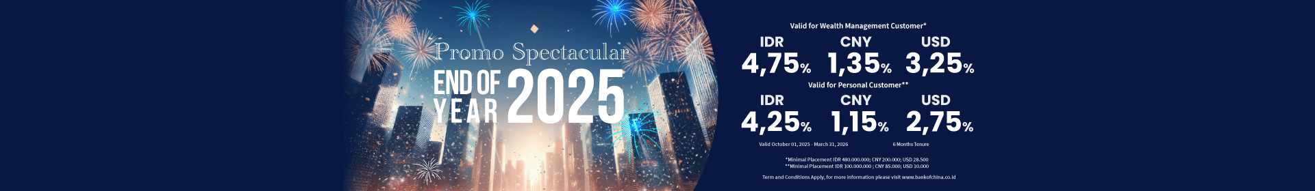- Newly registered Wealth Management customer during this promotion period, the customer should add their funds until TRB IDR 480.000.000 to be eligible to get “Promo Spectacular End of Year 2025”. After the newly registered WM customer has TRB IDR 480.000.000, they could place Time Deposit using existing fund with any amount and get “Promo Spectacular End of Year 2025” interest rate.